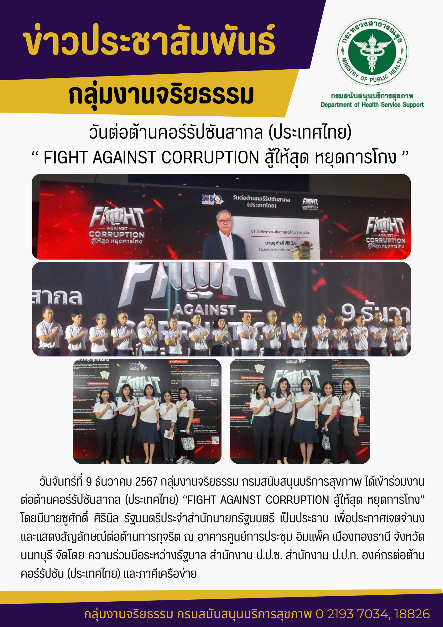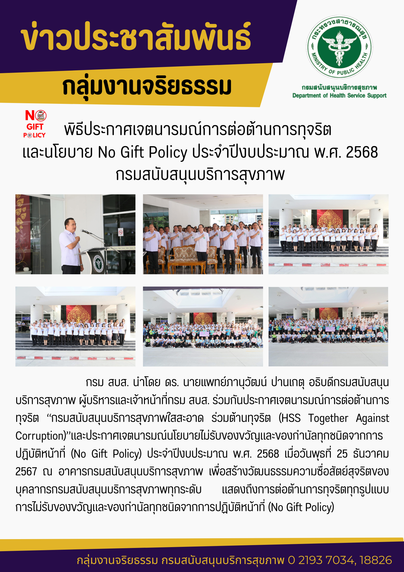 กรม สบส. ร่วมประกาศเจตนารมณ์ต่อต้านทุจริต เนื่องในพิธีประกาศเจตนารมณ์การต่อต้านการทุจริตของกระทรวงสาธารณสุข ภายใต้เเนวคิ...