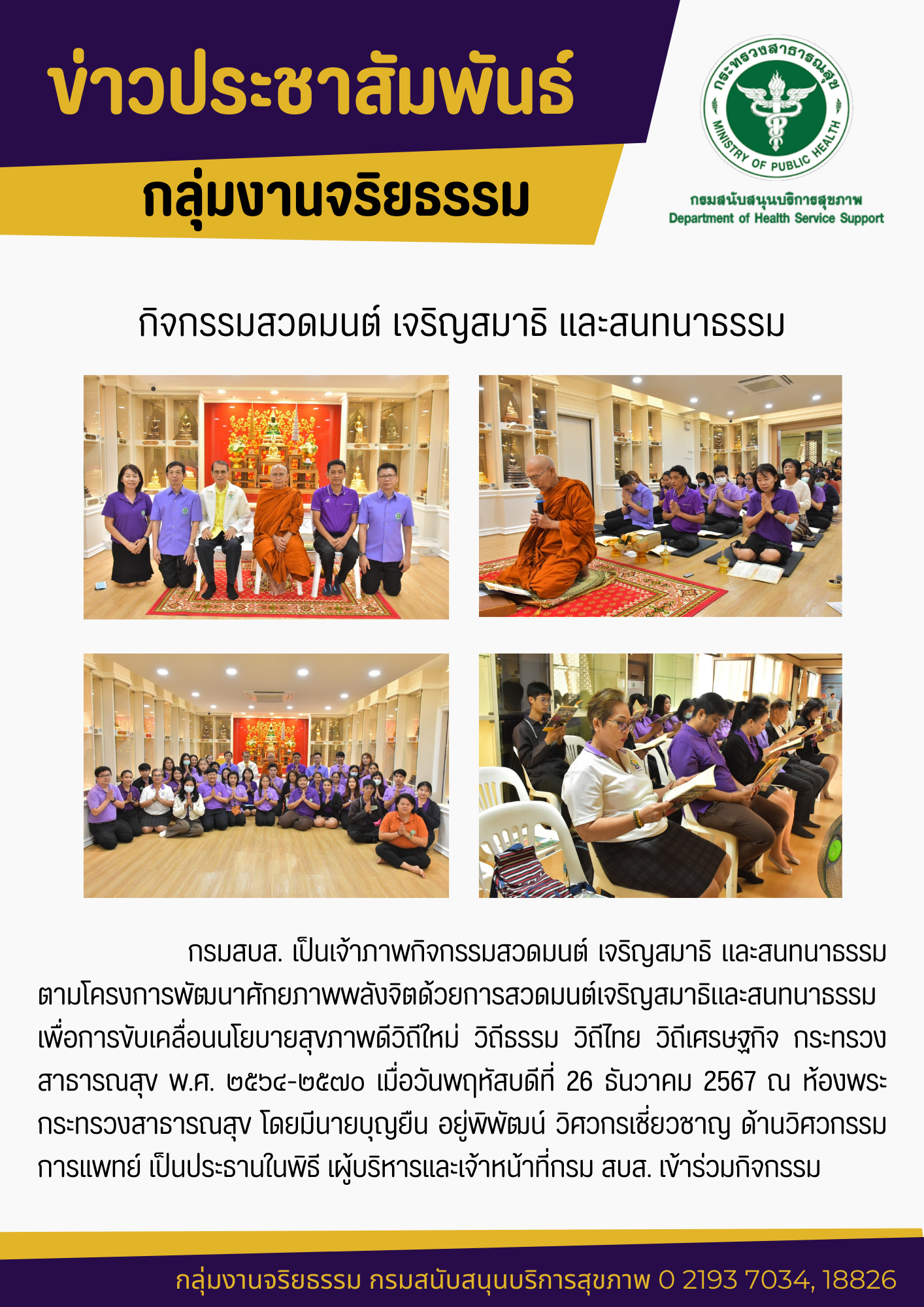 กรมสบส. เป็นเจ้าภาพกิจกรรมสวดมนต์ เจริญสมาธิ และสนทนาธรรมตามโครงการพัฒนาศักยภาพพลังจิตด้วยการสวดมนต์เจริญสมาธิและสนทนาธร...